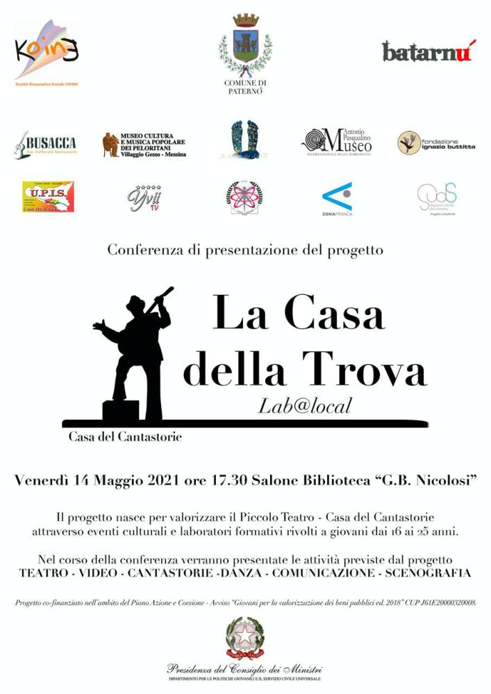 14 maggio 2021 – Presso i locali della Biblioteca comunale di Paternò si svolgerà la conferenza di presentazione del progetto LA CASA DEL TROVA, che avrà inizio a breve presso i locali del MUSEO - CASA DEL CANTASTORIE in Via Monastero a Paternò.